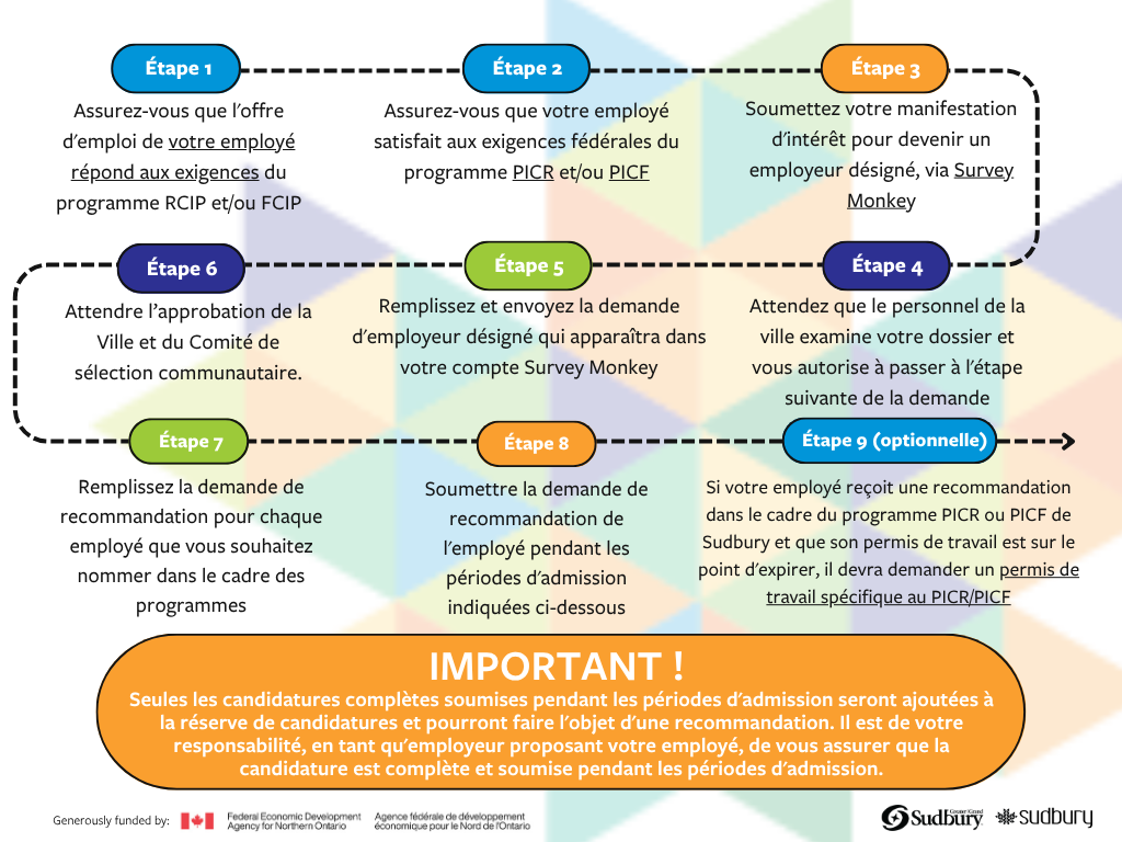 - Si un employeur recommande un candidat qui n’est pas encore situé dans les limites de la communauté RCIP/FCIP de Sudbury, l’employeur doit aider à trouver un logement pour l’employé avant que la recommandation ne soit finalisée et fournir un plan d’établissement au personnel de la Ville du Grand Sudbury.