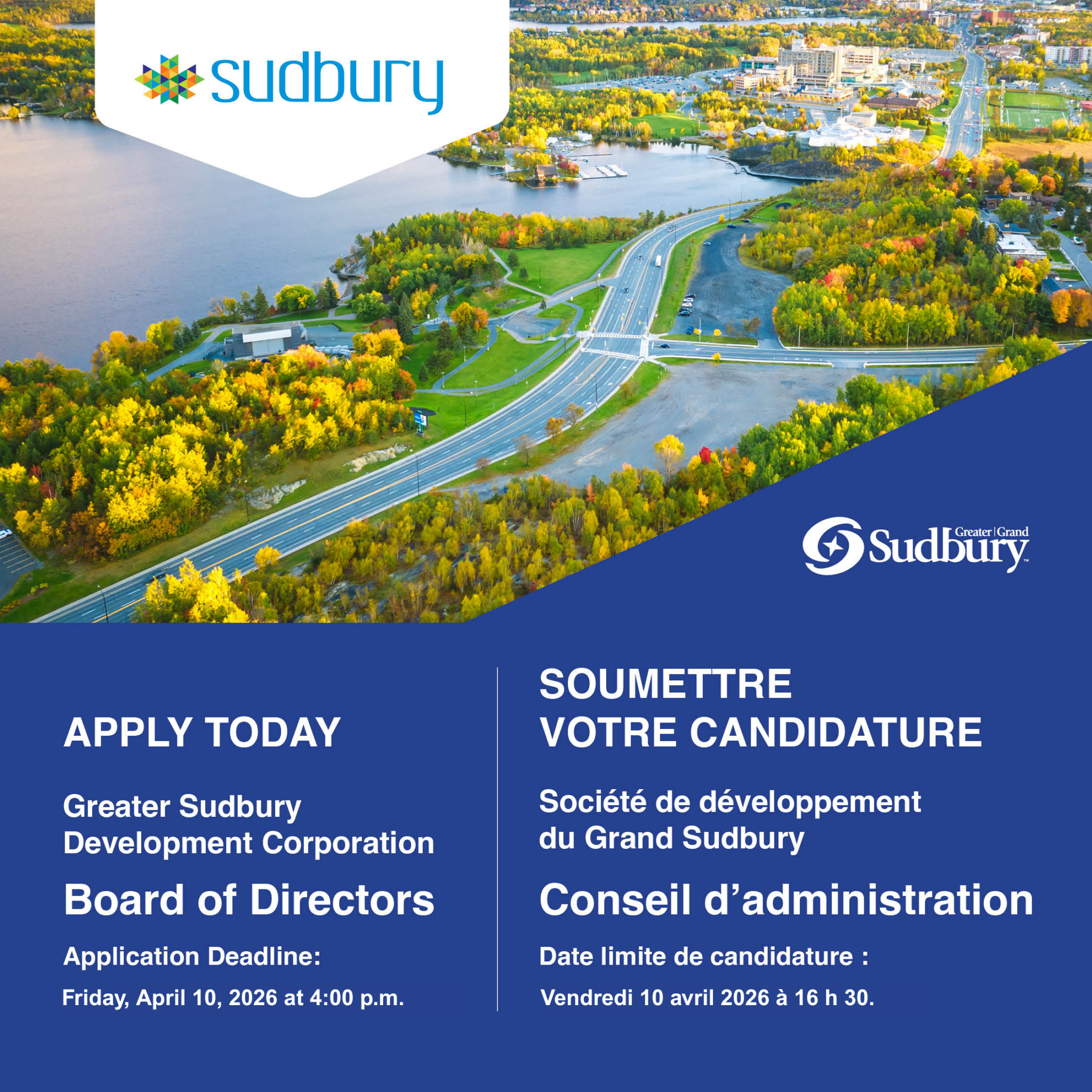 I-Greater Sudbury Development Corporation (GSDC), ibhodi yabaqondisi abangamavolontiya enamalungu ayi-18 egxile ekuthuthukisweni komnotho weDolobha laseGreater Sudbury, ifuna izakhamuzi ezihilelekile ukuba ziqokwe eBhodini Labaqondisi bayo bango-2025-28.